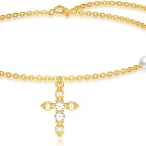 14K Gold Cross Anklet with Pearls for Women,Yellow Gold Religious Faith Cross Beach Adjustable Foot Ankle Bracelet Fine Jewelry Gifts for Her Wife Mom,8+1+1 inch