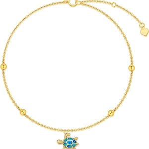 14K Gold Sea Turtle Anklet for Women Blue Opal Layered Ankle Bracelet Real Gold Beach Foot Jewelry Yellow Gold, 8''-10''