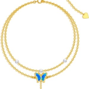 14K Real Gold Butterfly Anklets for Women Girls,Solid Gold Blue Opal Butterfly Ankle Bracelet Layered Foot Anklet Sea Beach Jewelry Gifts for Mothers Day Birthday 7.5/8+2 inch