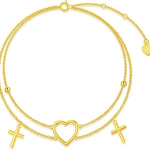 Solid 14K Gold Heart Cross Anklet for Women,Real Gold Layered Bead Ankle Bracelet FootSea Beach Jewelry Gifts for Wife Mom Sisters Birthday Christmas,8”-10”