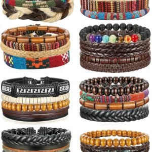 30PCS Braided Leather Bracelets for Men Women Wrap Wood Beads Bracelet Woven Ethnic Tribal Rope Wristbands Bracelets Set Adjustable