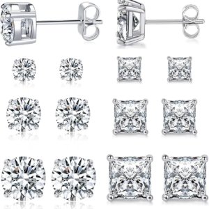 6 Pairs Stud Earrings Set 3mm/5mm/7mm Princess & Round Cubic Zirconia Earrings Hypoallergenic 316L Surgical Stainless Steel CZ Earrings for Women Men