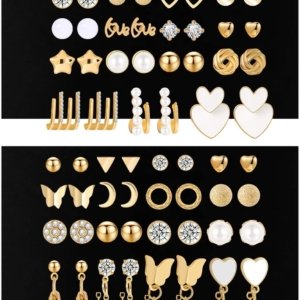 68 Pairs Gold Stud Earrings for Women Multipack, Hypoallergenic Assorted Earring Set Multiple Piercings, Cubic Zirconia Pearl Butterfly Stud Hoop Earring Pack