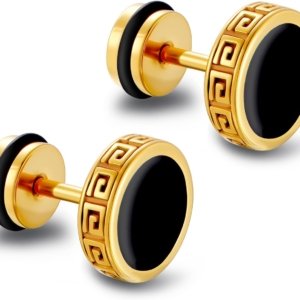 Upgraded Hypoallergenic earrings for men,Mens surgical steel black stud earring jewelry,Great Wall wall grain round cake shape,Single black gel 0.4 inches wide