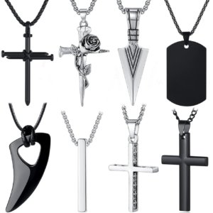 8 Pcs Necklace for Men, Mens Necklaces Jewelry Set, Black and Silver Stainless Steel Necklace, Cross Pendant Necklace, 16-24 inches Chain