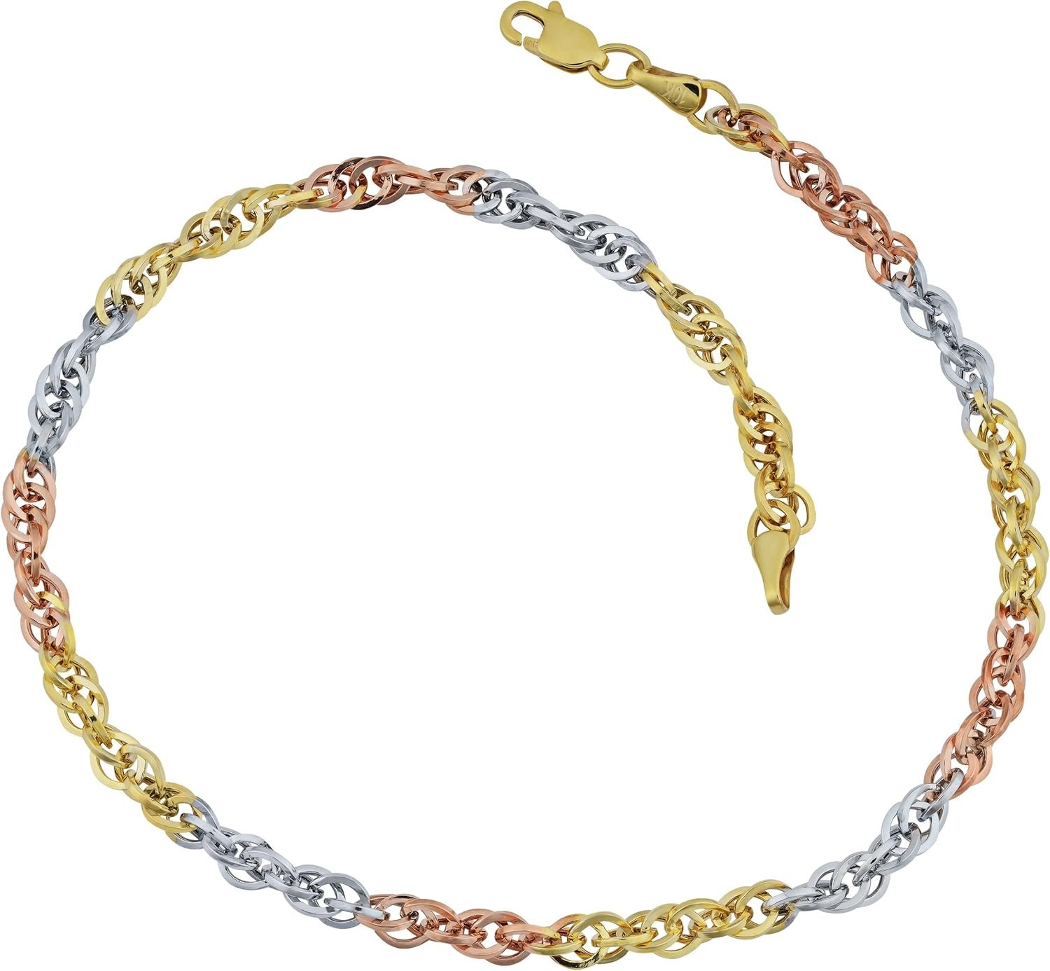 - DIMENSIONS – This gold anklet is 3.8 millimeters wide and 10 inches or 2.5.4 centimeters long. This tri-color gold anklet secures with a lobster claw clasp. It weighs 3 grams.