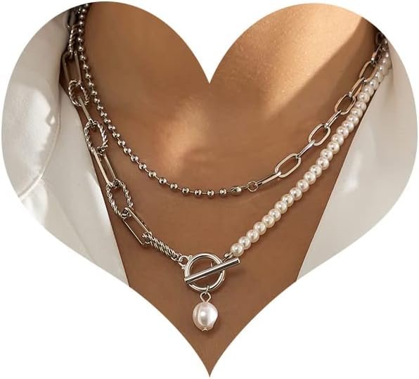 Dainty Silver Layered Baroque Pearl OT Clasp Necklace Stacking Beaded Ball Chain Paperclip Pearl Chain Retro Necklace for Women