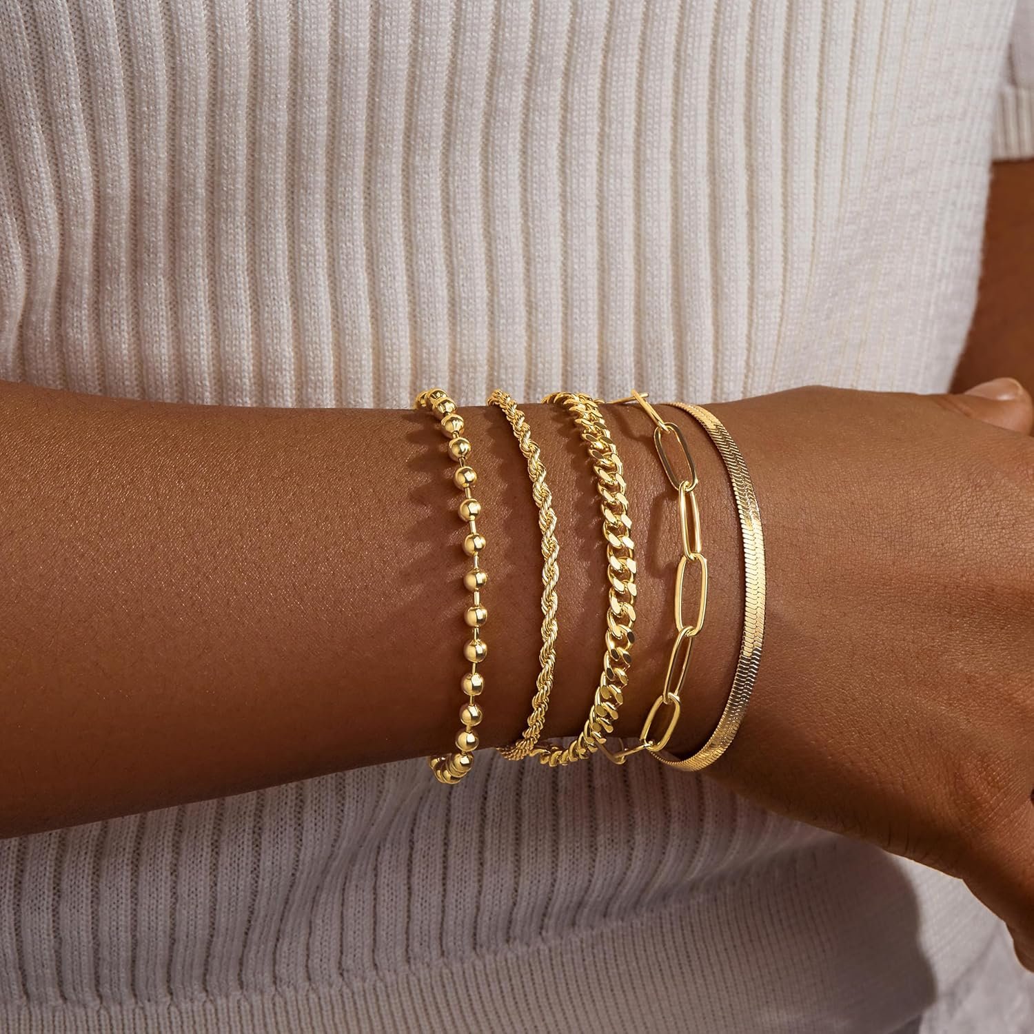 - STYLISH BRACELET SET: You will receive 5 dainty gold bracelets in individual styles. Our gold bracelets for women trendy include cuban chain, rope chain, paperclip chain, figaro chain and satellite chain. You can combine and match them as you wish