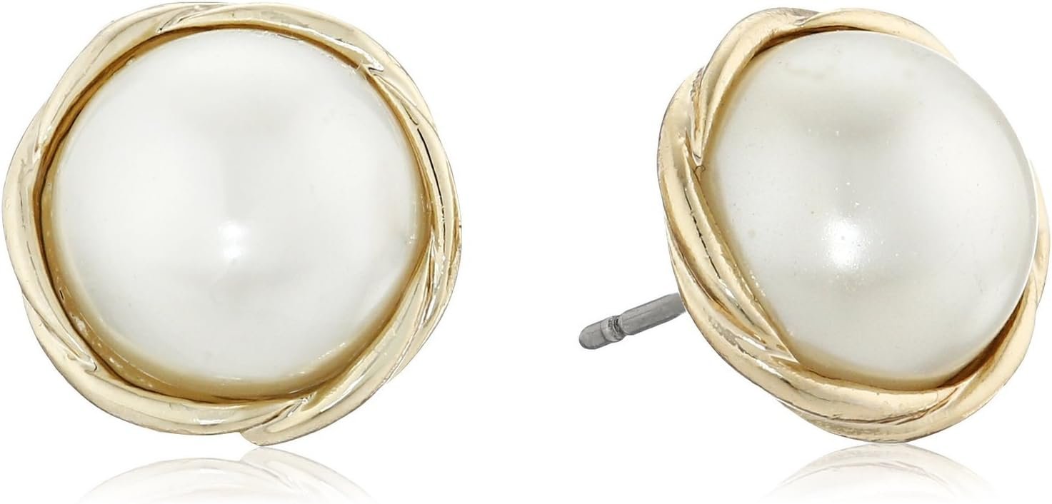 - GOLD TONE & FAUX PEARL STUDS: Your eye for style shines bright with these stud earrings featuring faux-pearl rounds in twisted gold-tone frames. They feature bullet-clutch with disc backings.