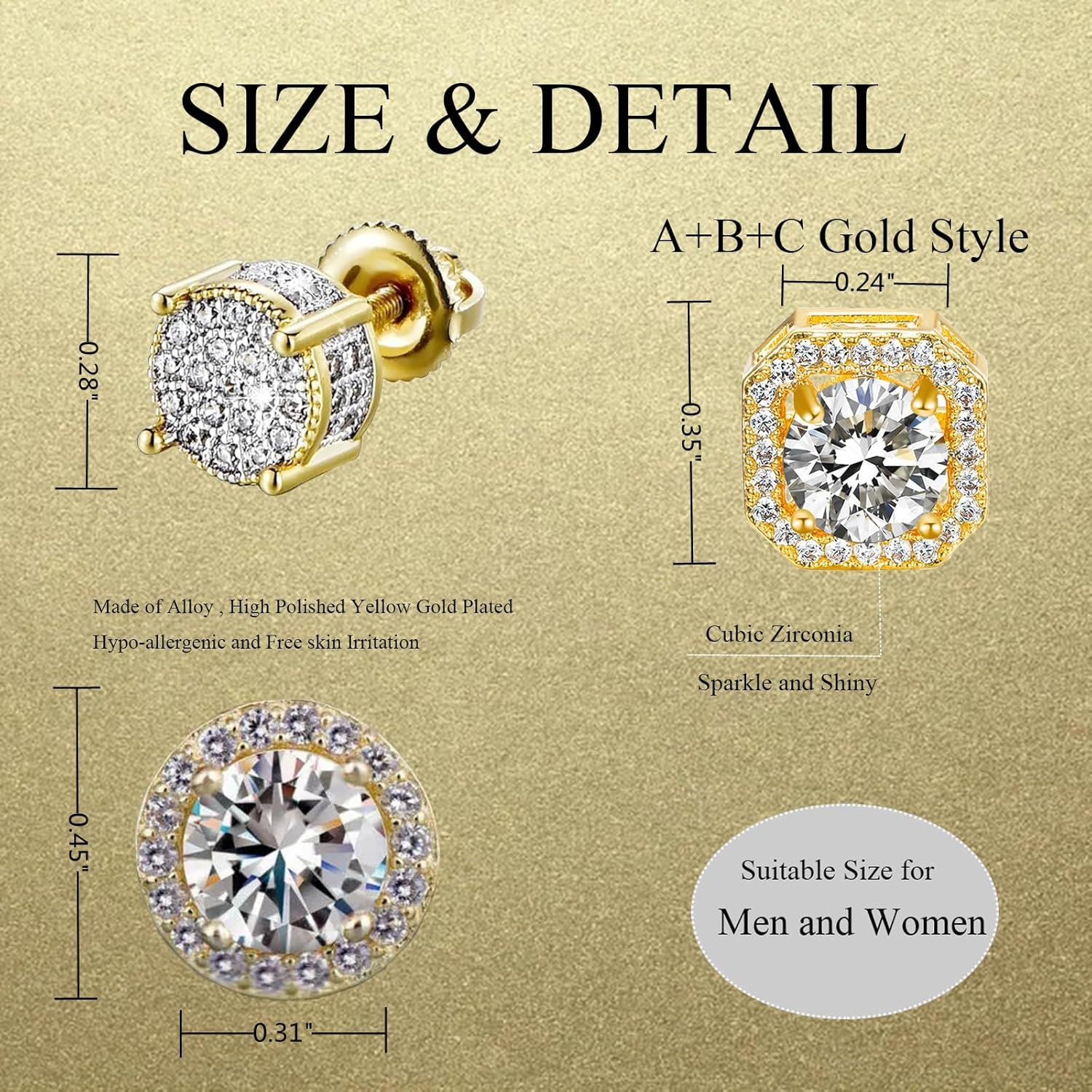 - Hypoallergenic Earrings: These sparkle earrings are made of high-quality brass and cubic zirconia, highly polished 18K gold plated.There are three different ear studs, and the A style belongs to the screw back stud earrings.